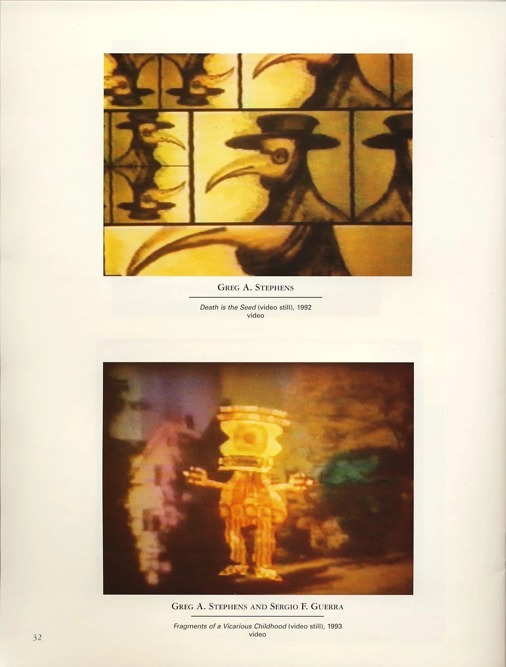 “Computer animation and an electronic soundtrack composed by the artist are the basic technical elements of Greg A. Stephens’s video Death is the Seed. Using images of demons, angels, saints, and martyrs from the history of Western art, Stephens creates shifting visual patterns. Symbols of death come alive, as it were, in a pulsating fabric of mortality. The sampled vocal line ‘When I become death, death is the seed from which I grow,’ ironic in its sinister delivery, is spoken by poet William S. Burroughs.